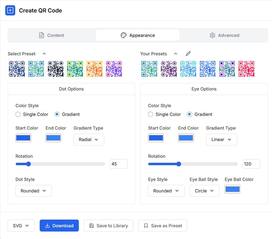- Access built-in QR design presets or save your own custom presets for fast styling.