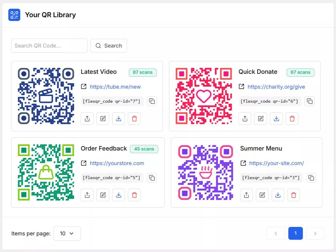 - Easily copy shortcodes, download, or delete QR codes from the library.