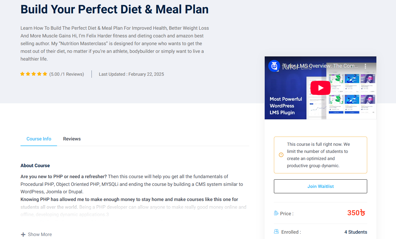 ✅ „Join Waitlist“ – Automatically appears on fully booked Tutor LMS courses